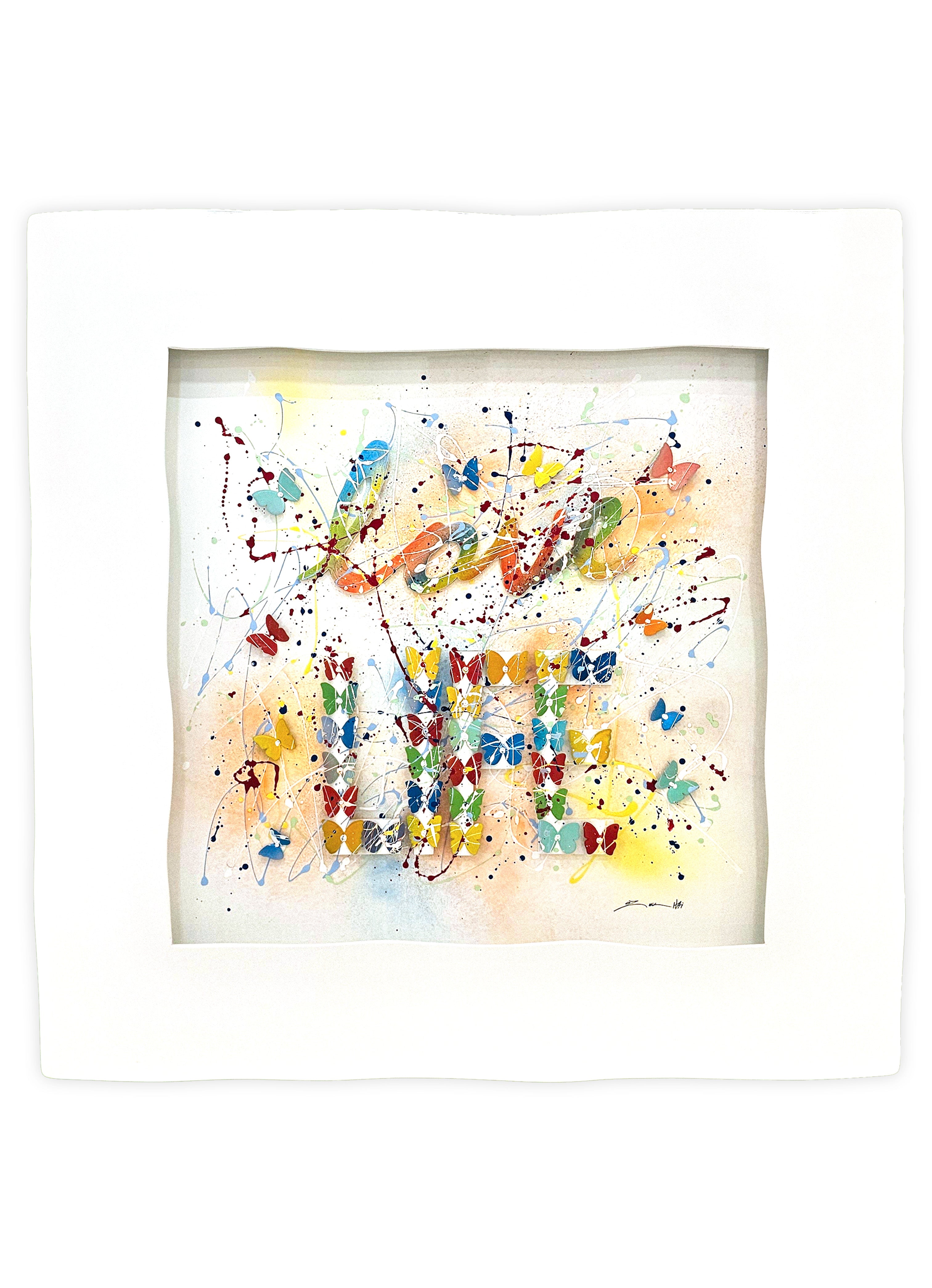 Artist: Oz El HaiMedium: Mixed media on wood with hand-painted car paints and lacquer finish, featuring colorful metal butterfliesDimensions: 96 × 76 cmEdition: Unique original –...