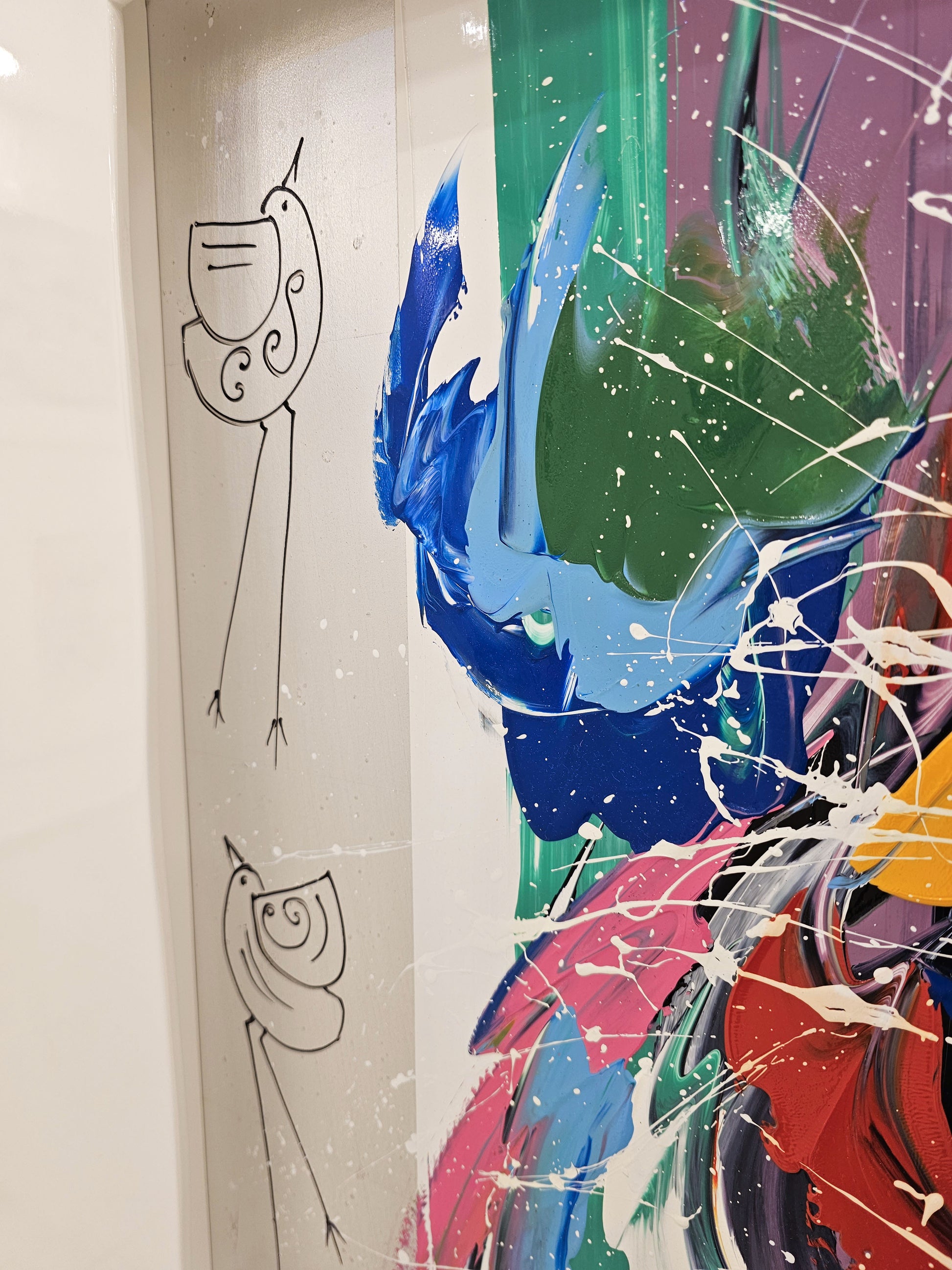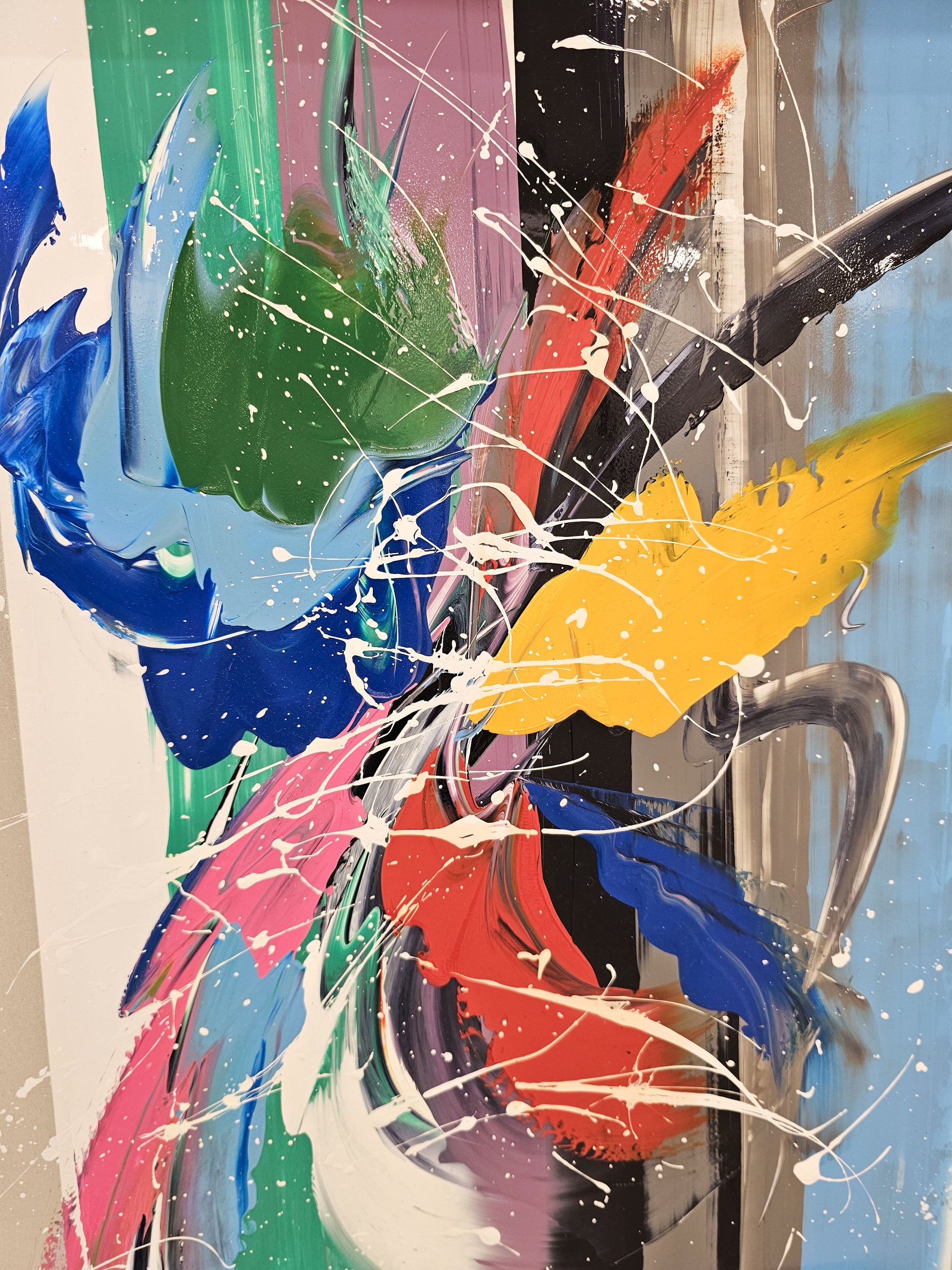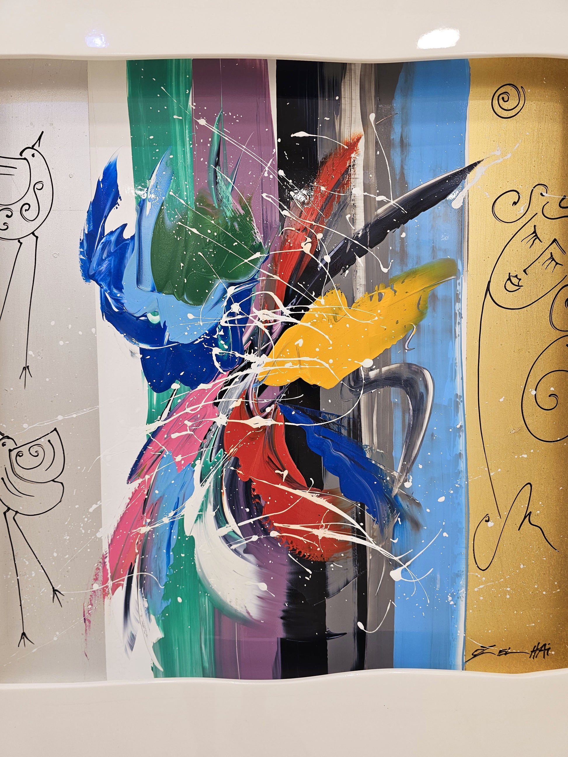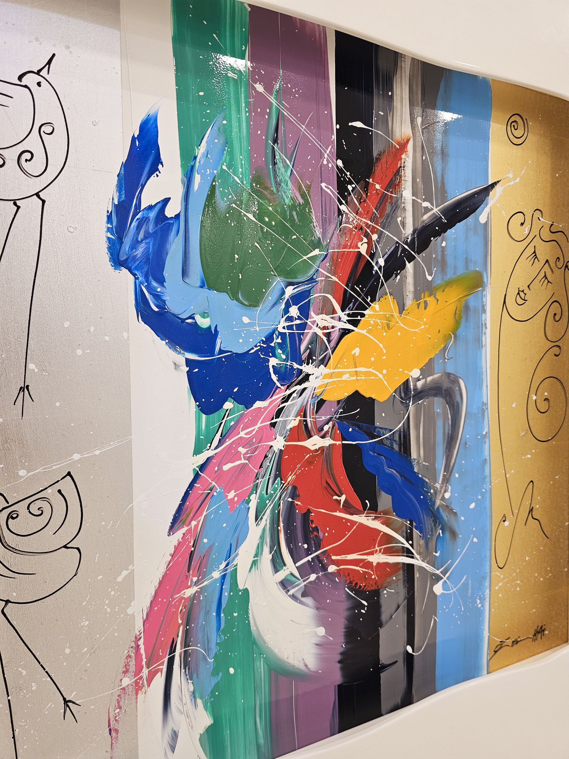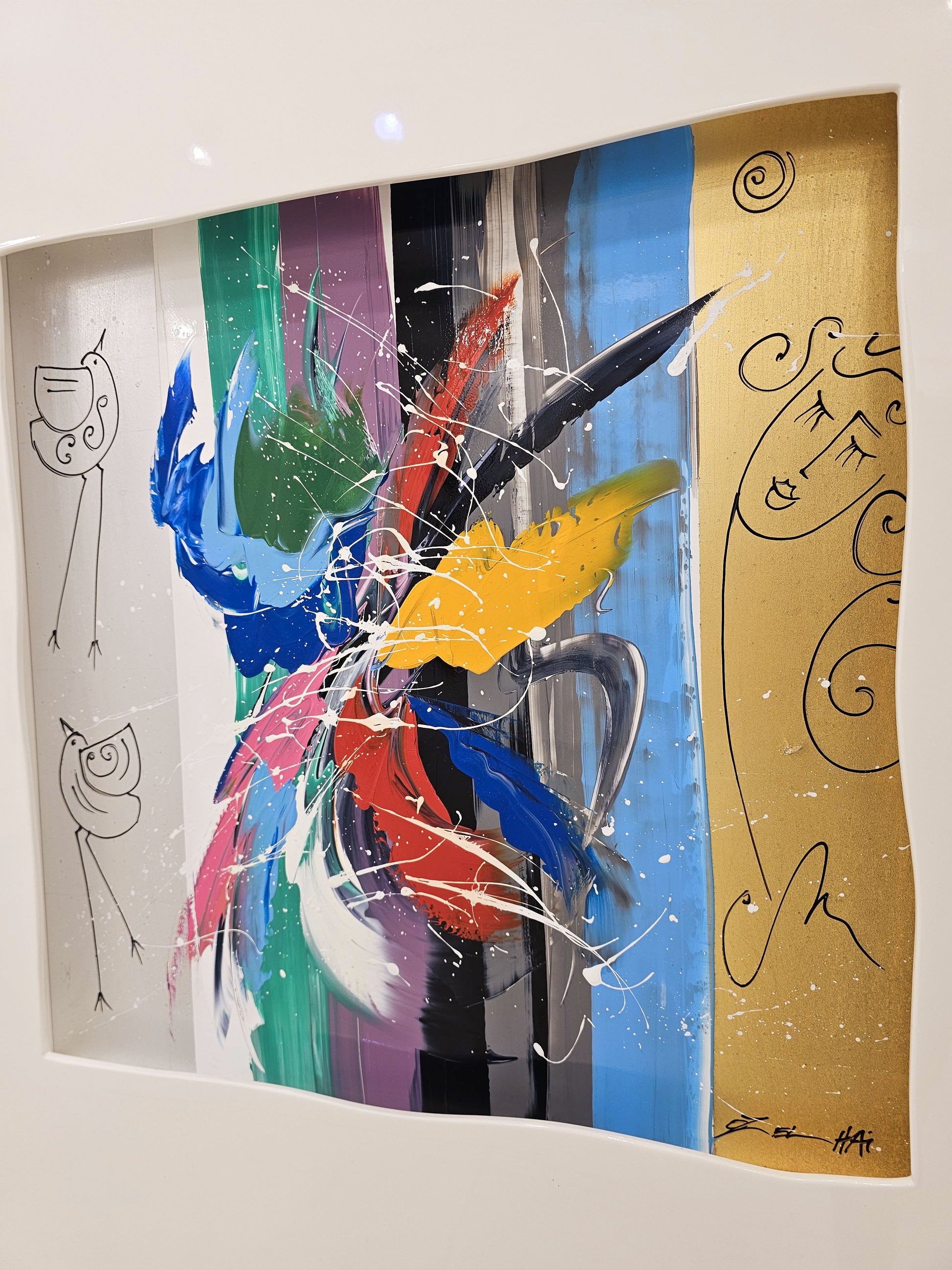 Abstract Harmony by Oz El Hai merges abstract vibrancy with symbolic depth. At the heart of the piece, dynamic strokes of blue, red, gold, and white burst outward in energetic harmony, while delicate line drawings of doves emerge on the left – eternal messengers of peace and hope in Israel. On the right, the silhouette of a woman’s face adds a human presence, suggesting spirituality, resilience, and the eternal connection of people to the land.