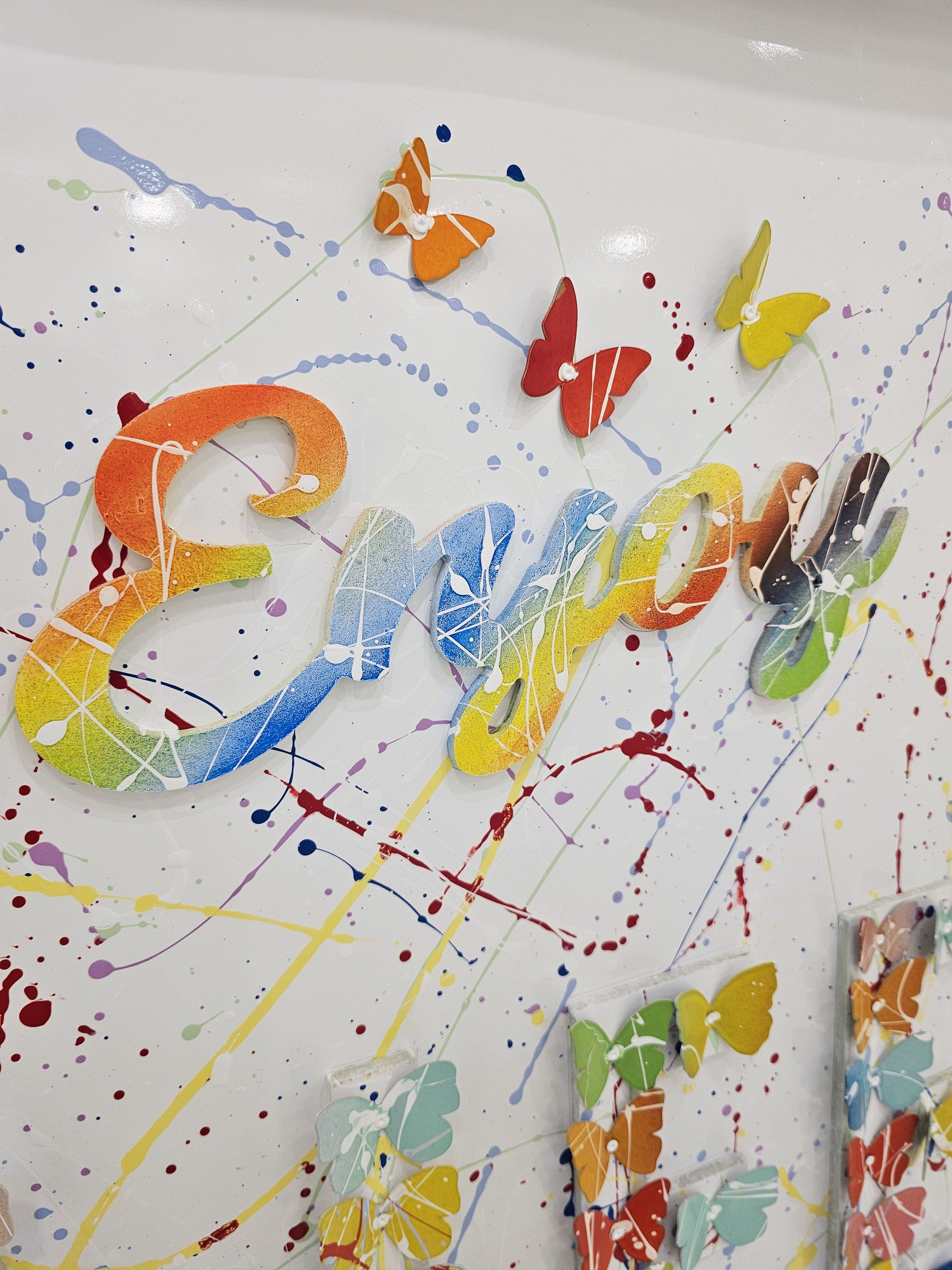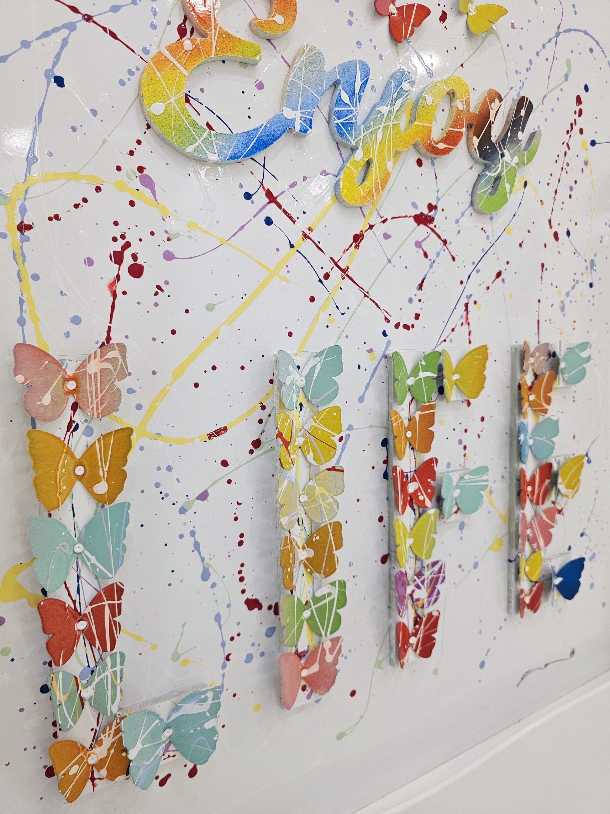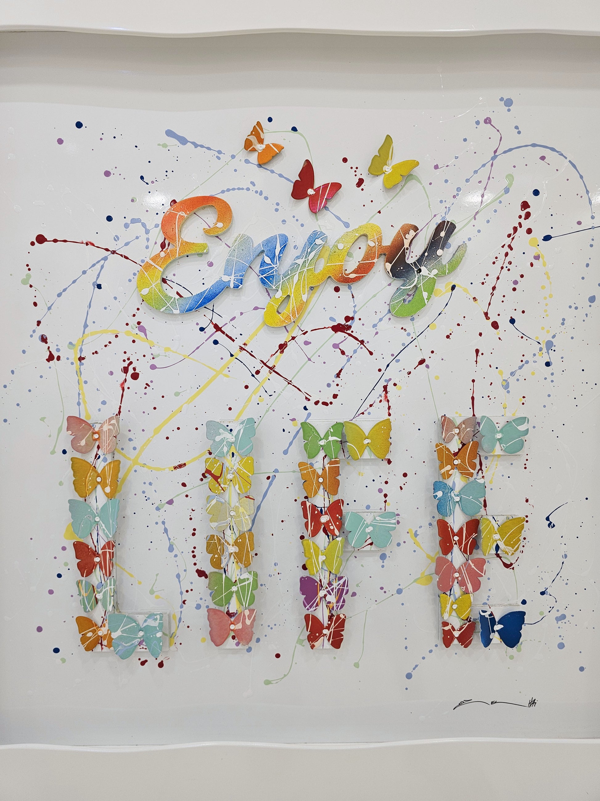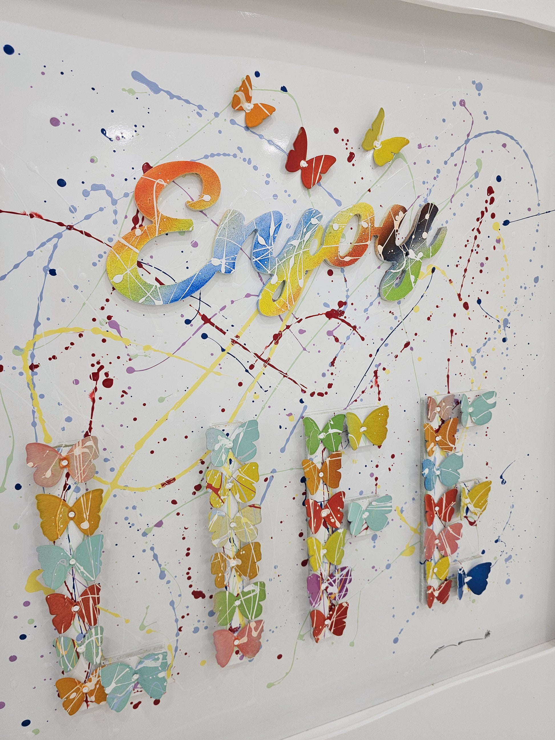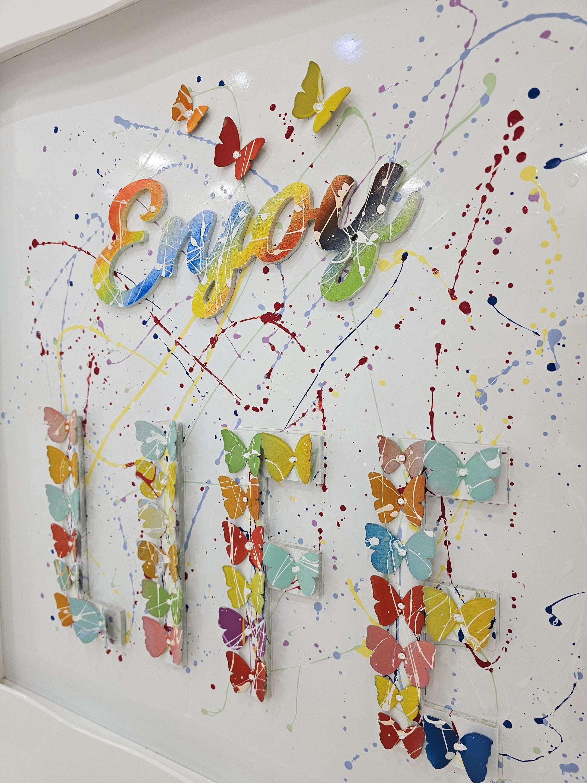 Enjoy Life is a vibrant statement artwork by Oz El Hai that combines bold typography with a burst of colorful butterflies. The word “LIFE” is built from sculptural butterflies, while the word “Enjoy” dances above in a joyful rainbow palette, expressing freedom, happiness, and positivity. Each butterfly symbolizes transformation and vitality, coming together to create a piece that radiates energy and optimism.
