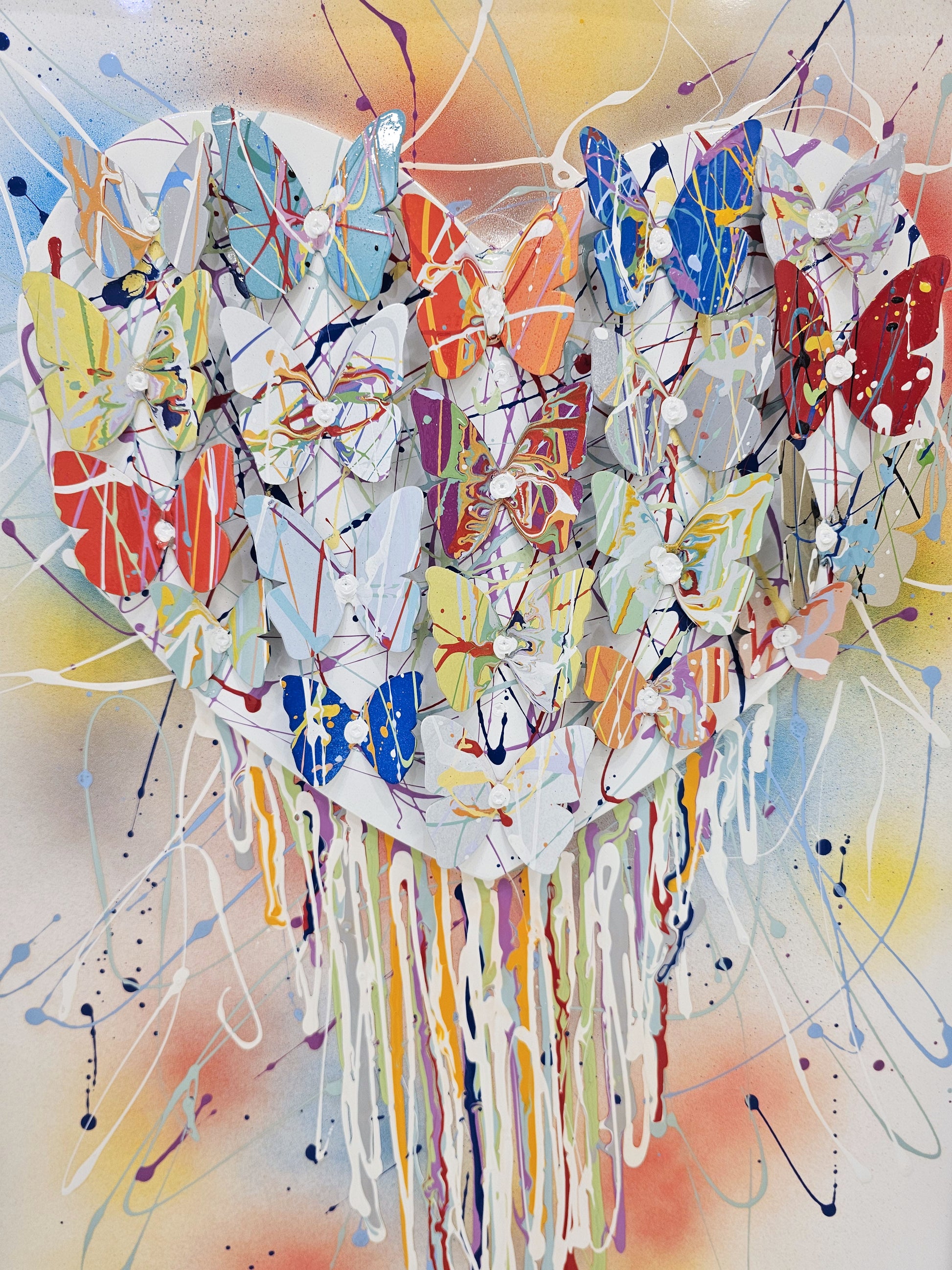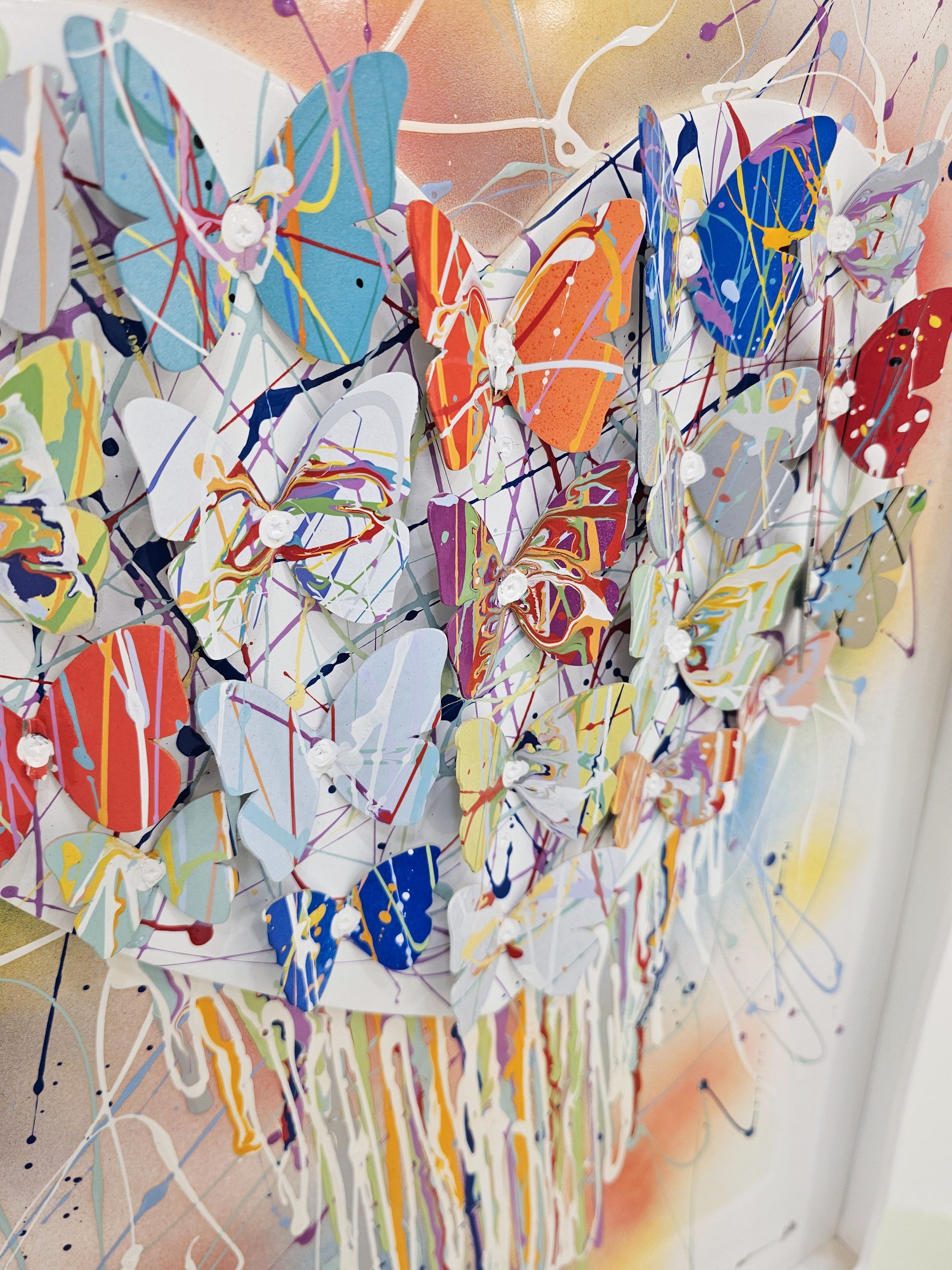 Framed Dripping Colorful Heart is a stunning modern creation by Oz El Hai. Built from 3D butterflies in a vivid explosion of colors, the heart shape seems to pulse with life and joy. Beneath it, dynamic dripping paint flows downward, adding movement and energy to the piece.