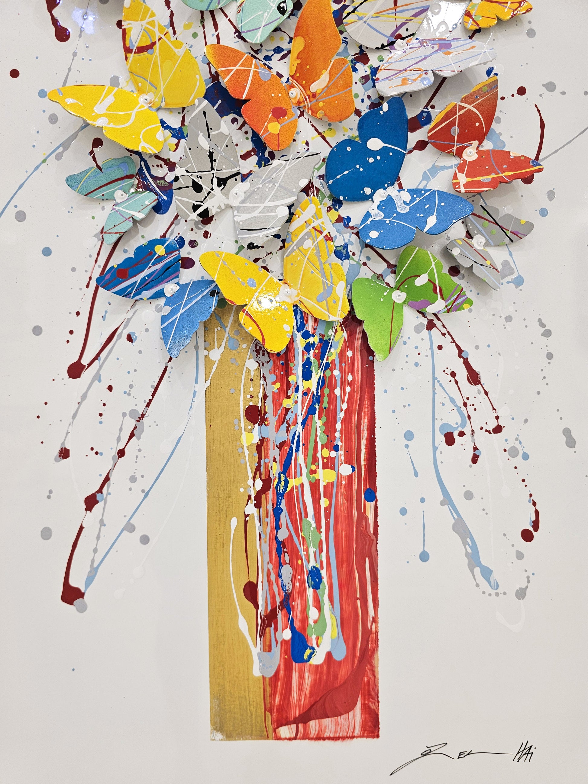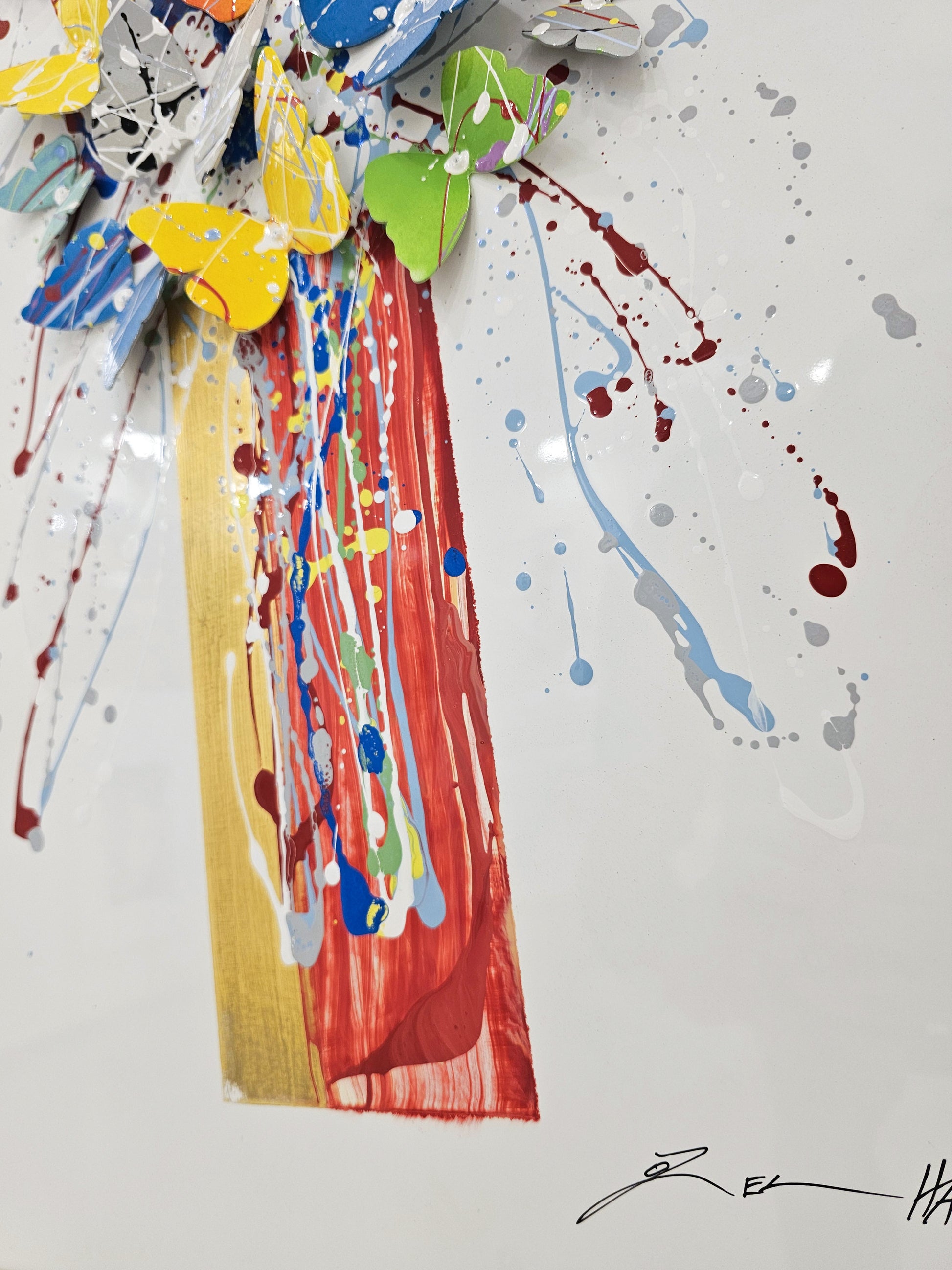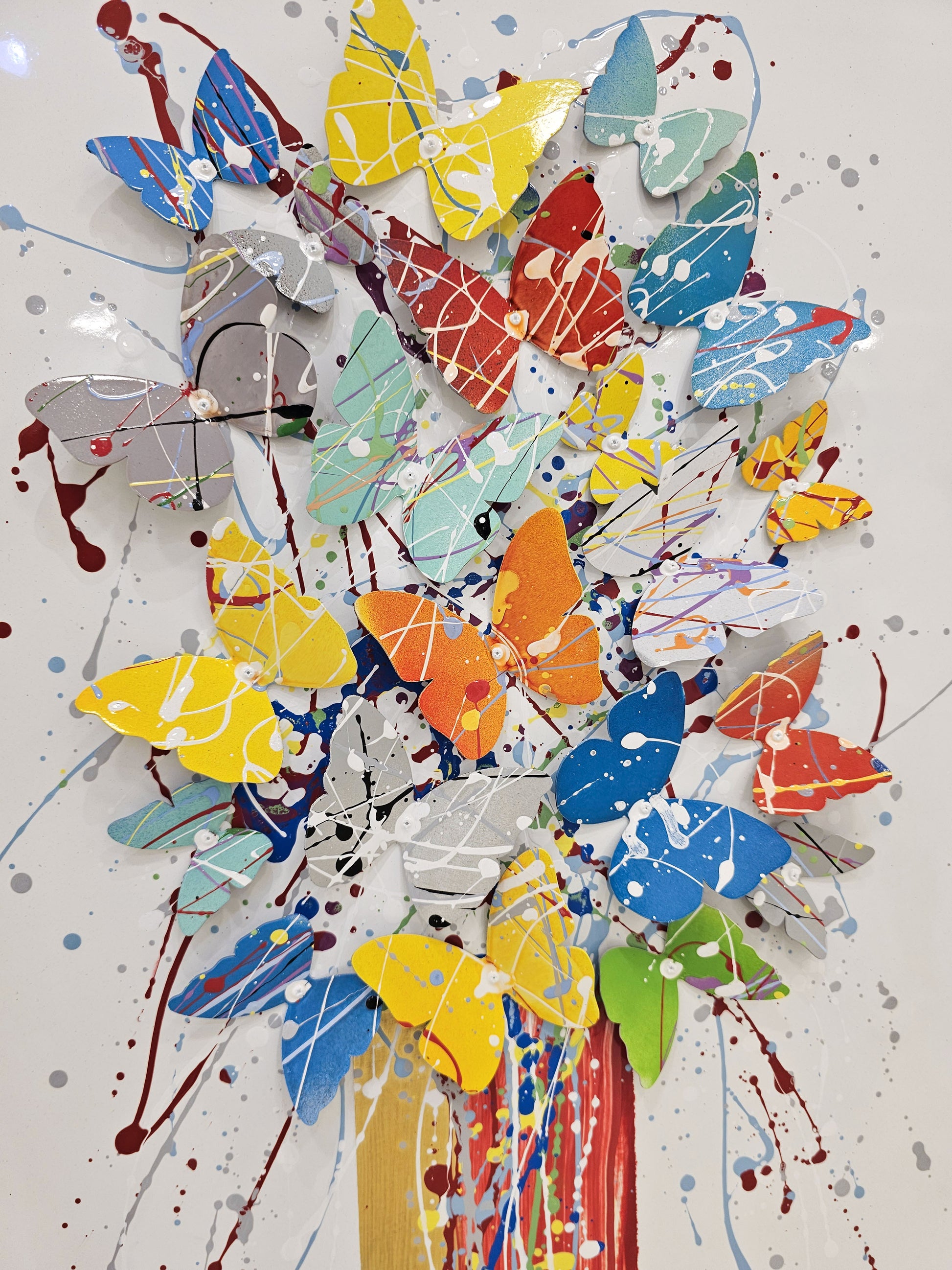 The butterflies, alive with motion and color, transform the tree into a celebration of freedom and vitality. The golden and red tones of the trunk provide grounding warmth, while the colorful wings radiate hope and joy, making the artwork both uplifting and deeply meaningful.