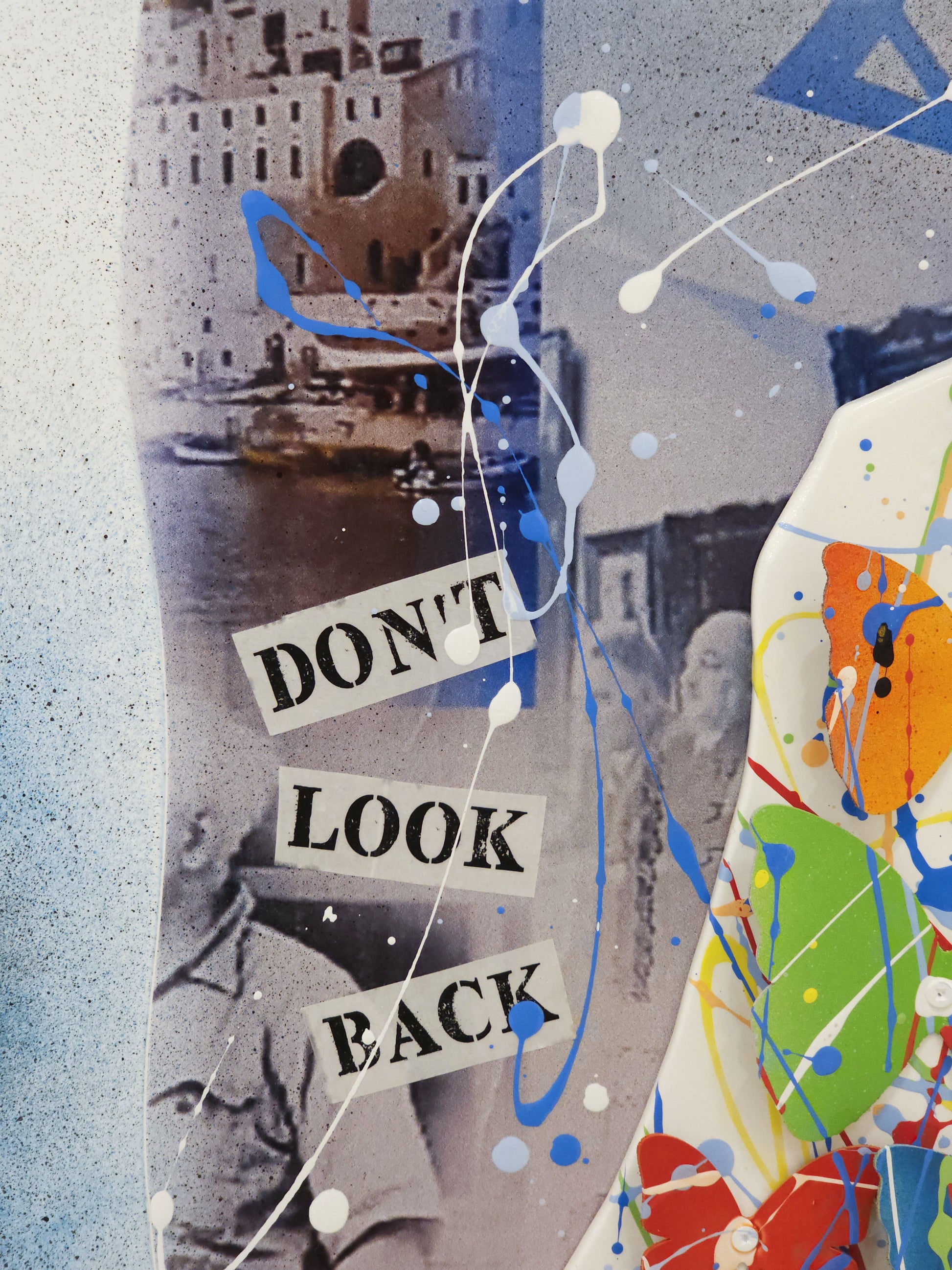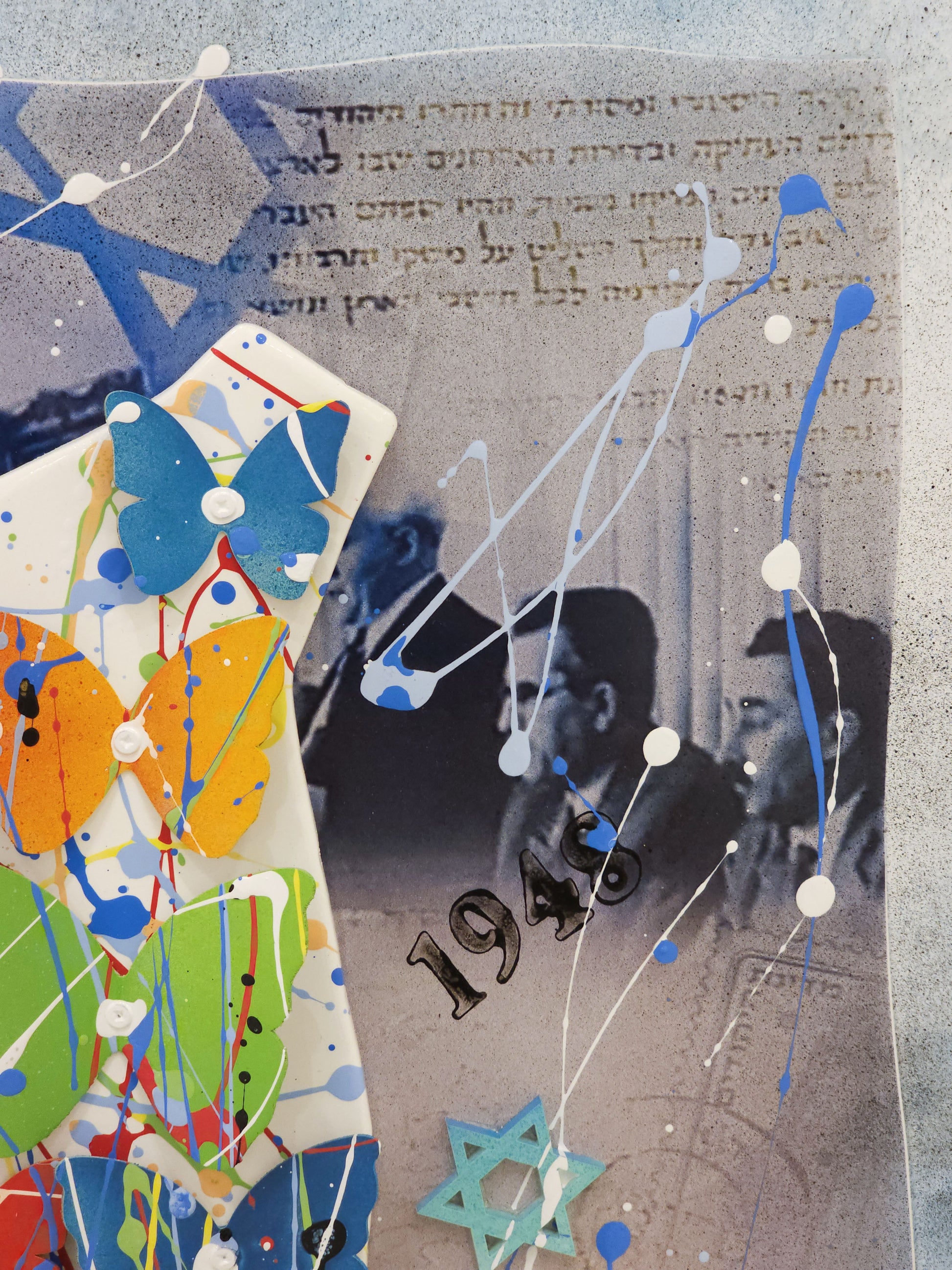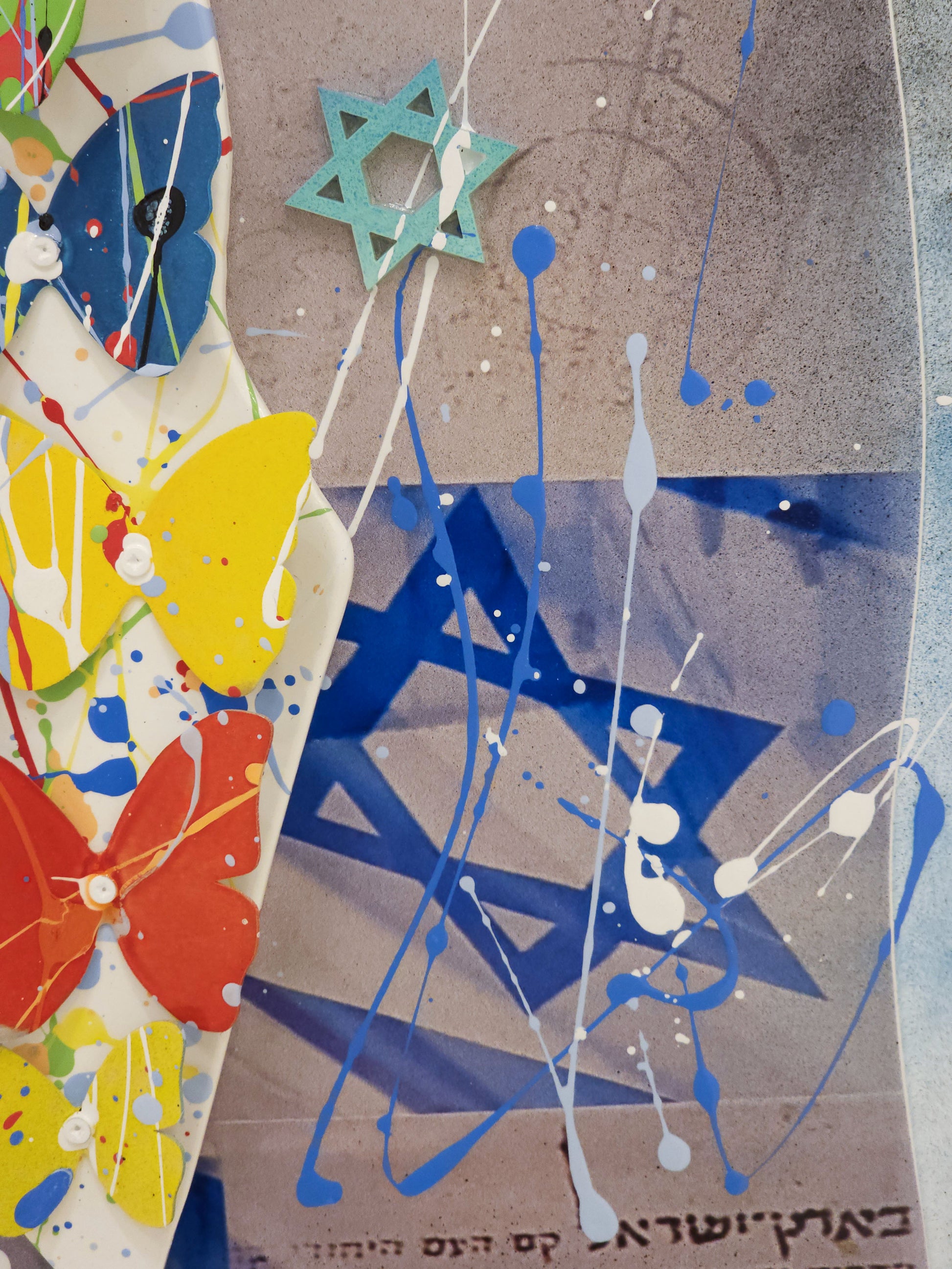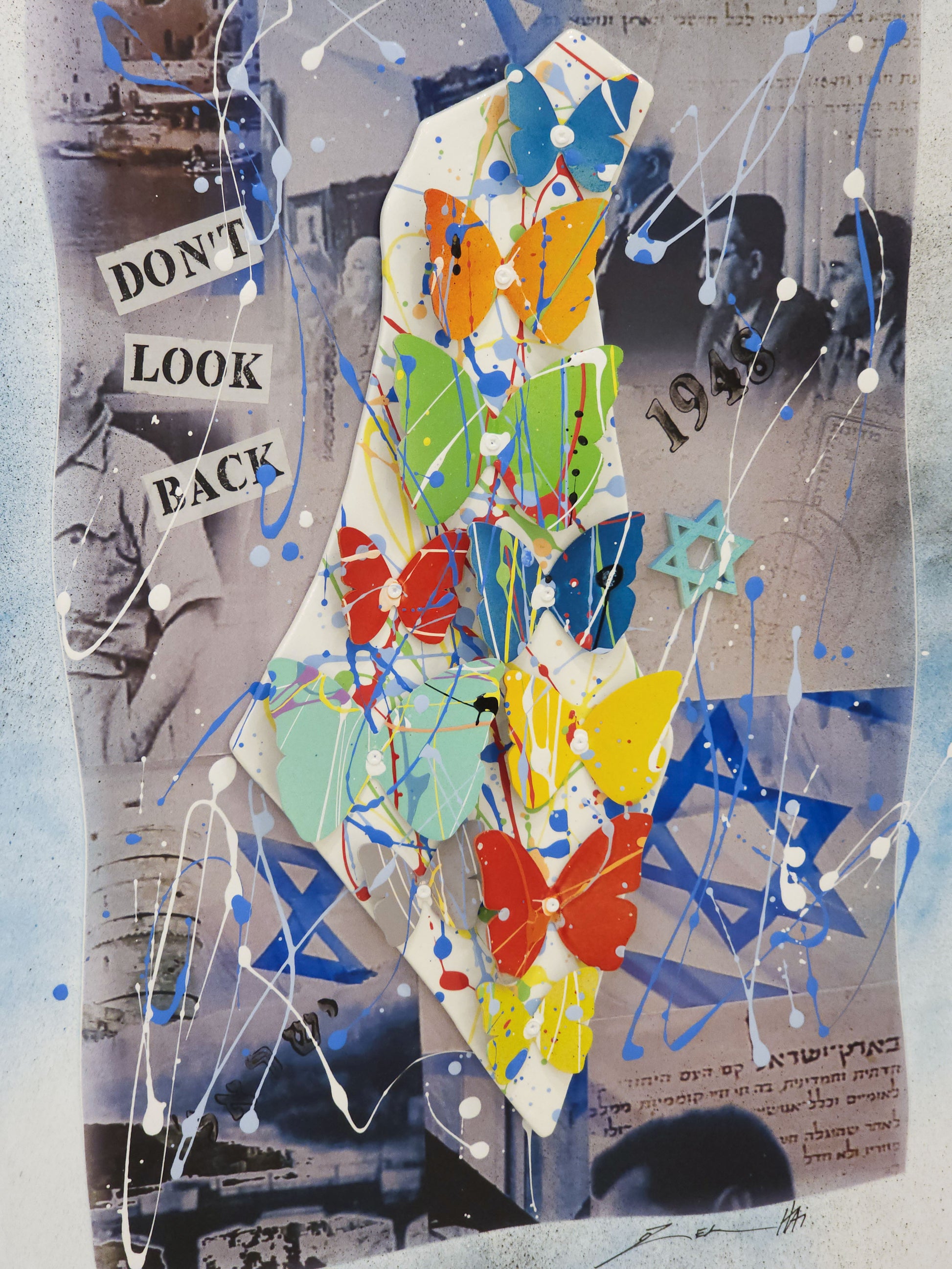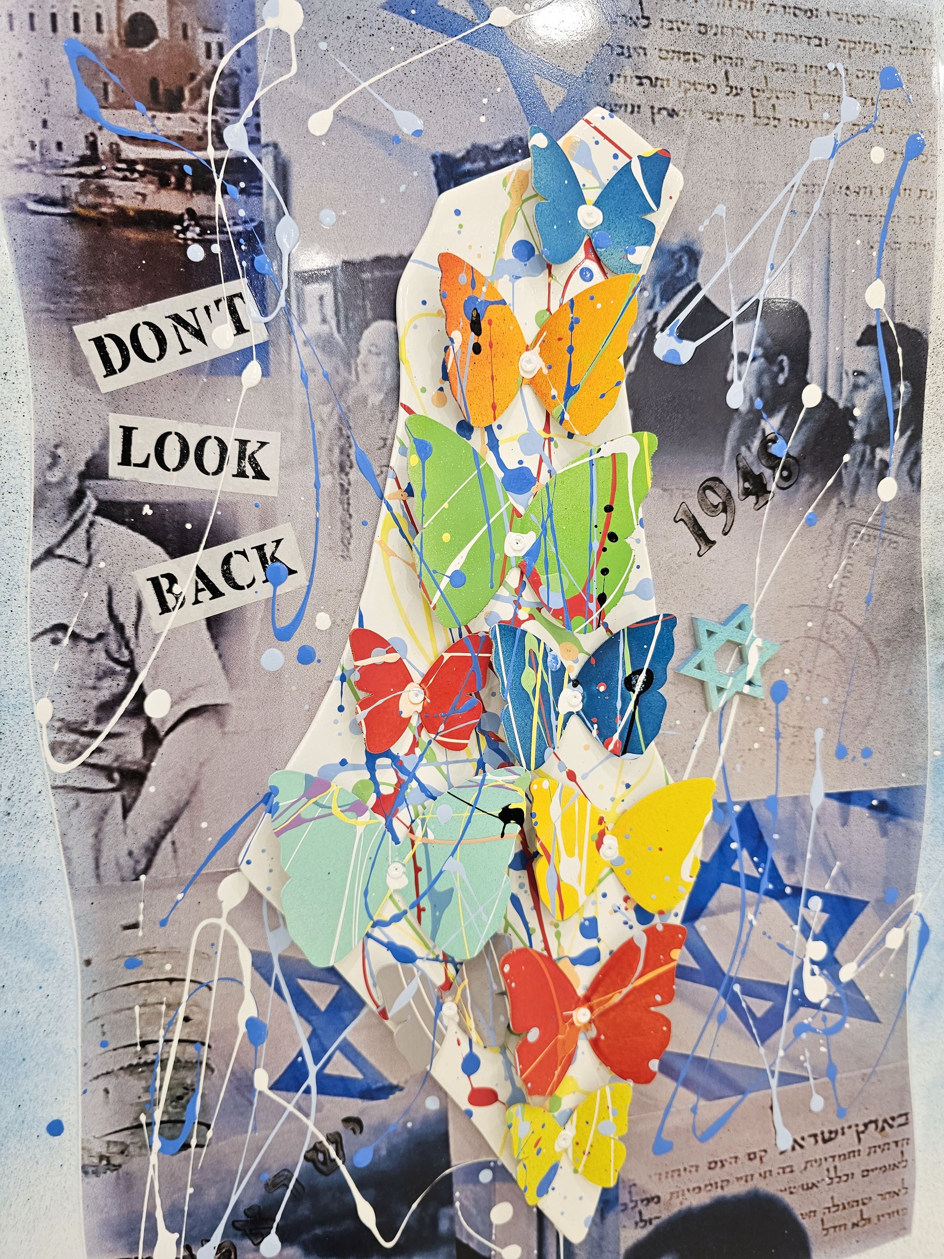 Behind the butterflies, the 1948 Declaration of Independence and the Star of David highlight the unbreakable link between Israel’s historic past and its modern identity. The bold phrase “DON’T LOOK BACK” adds a contemporary voice, inspiring resilience and progress while staying rooted in heritage.