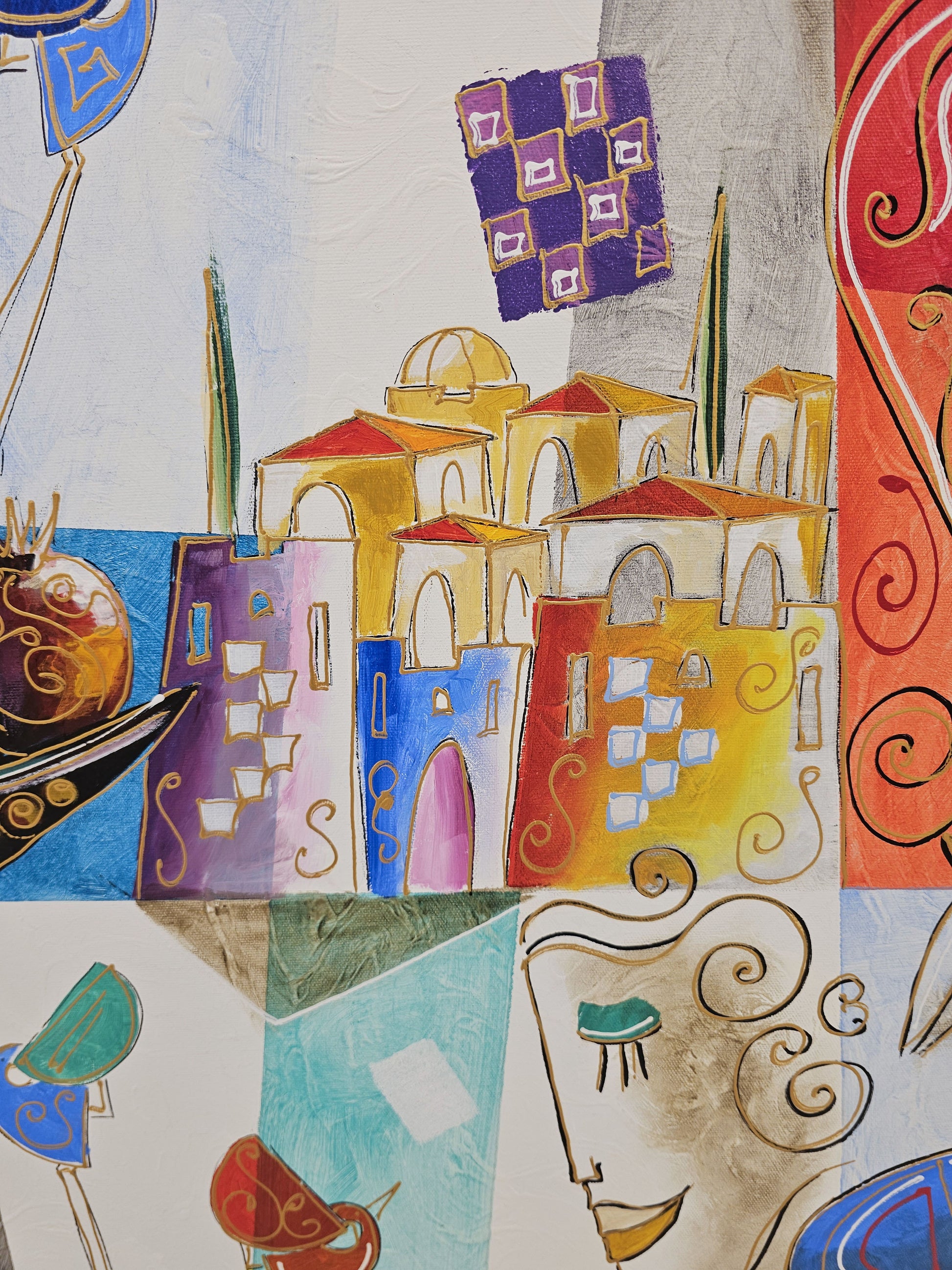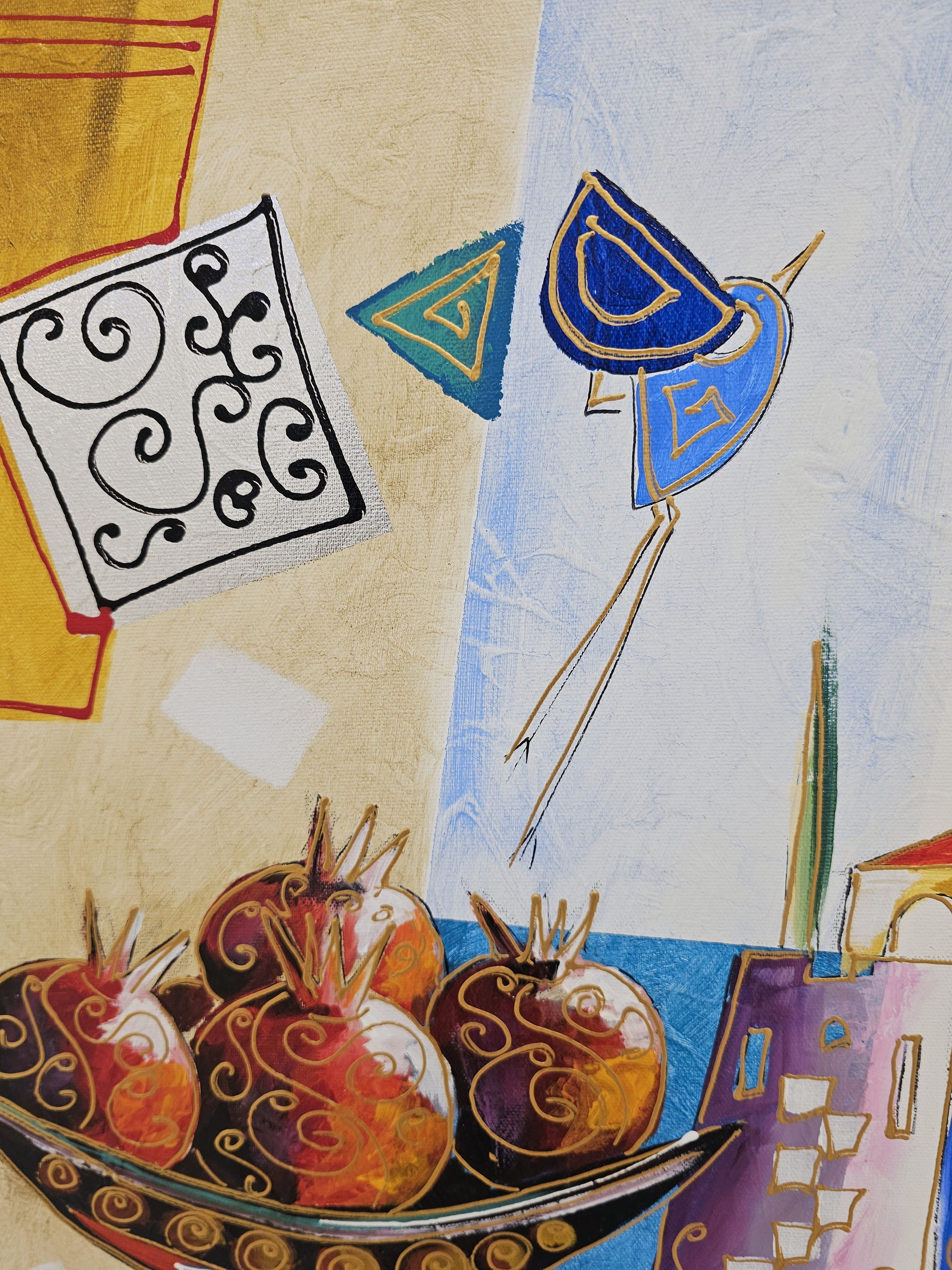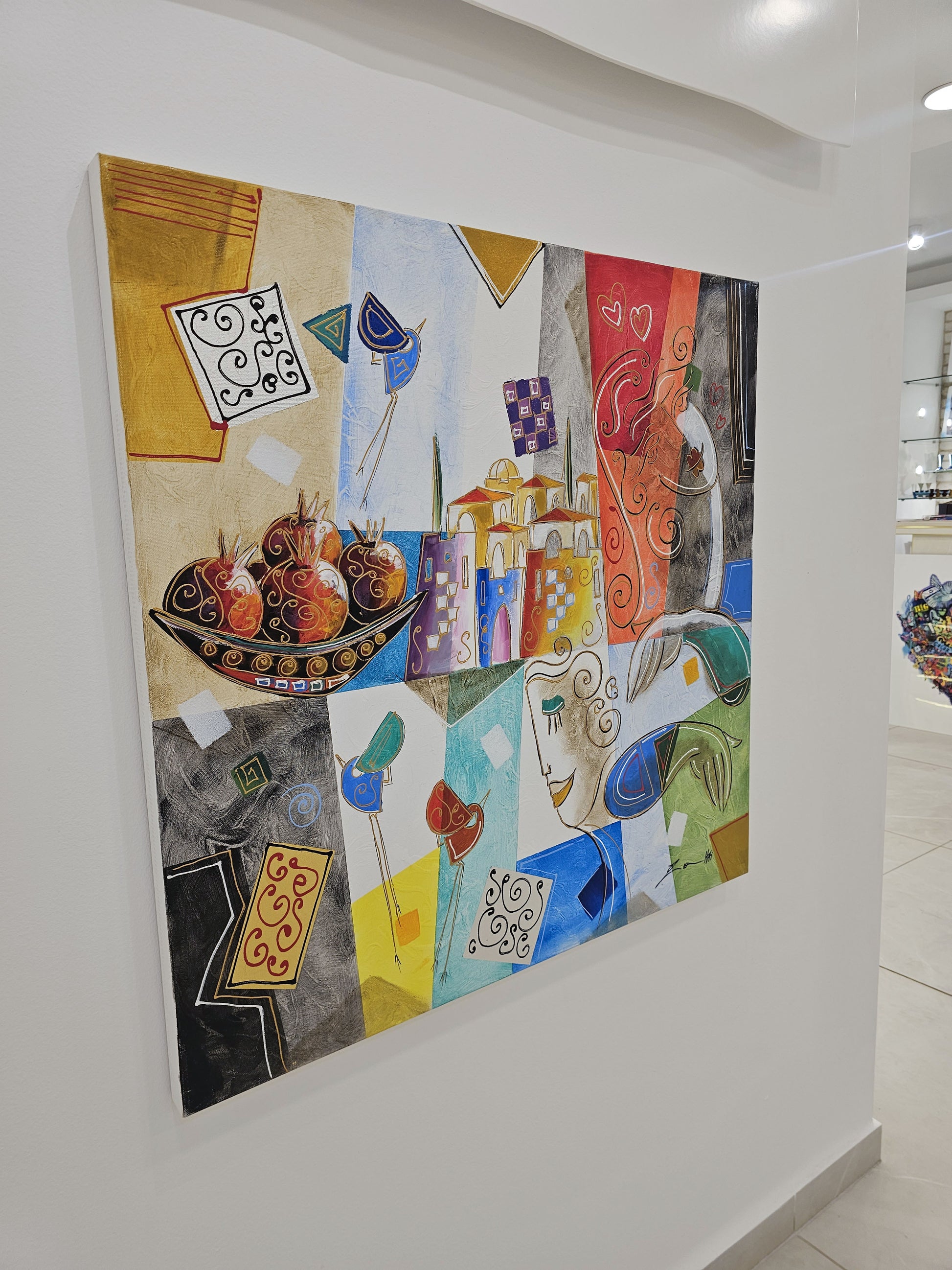 Pomegranates of Jerusalem by Israeli artist Oz El Hai is a vibrant and symbolic oil on canvas that blends abstract forms with cultural motifs. The composition features a colorful Jerusalem cityscape, flowing human figures, and a striking bowl of pomegranates — a timeless symbol of abundance, blessing, and Jewish tradition.